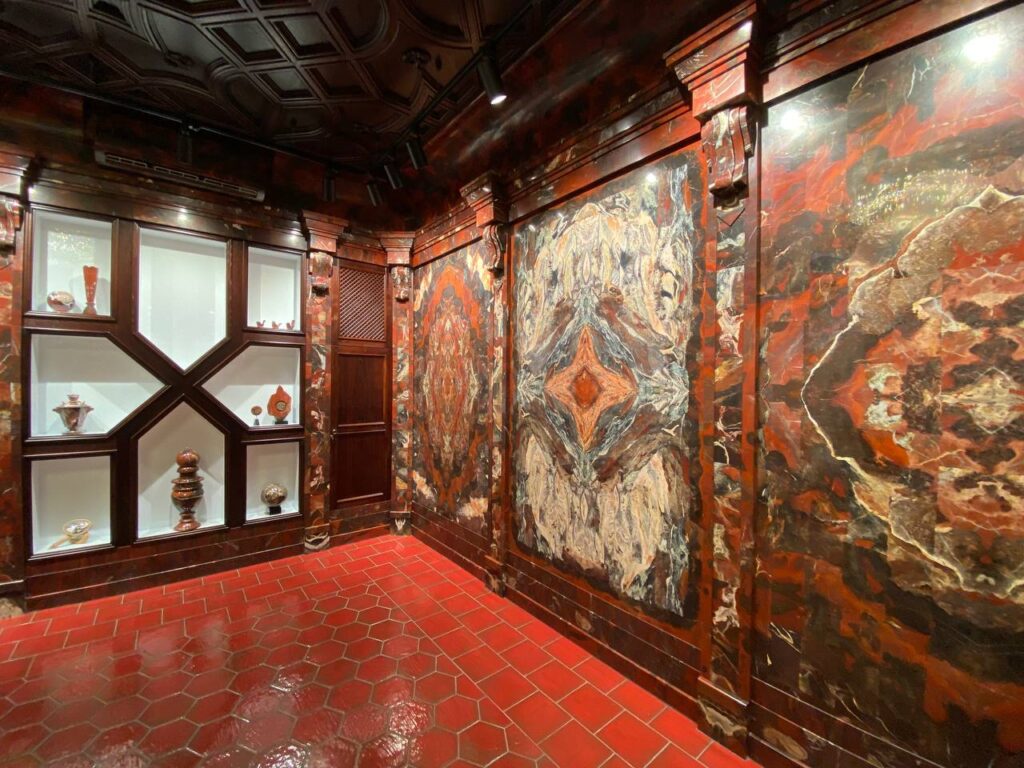 В Яшмовой комнате 9 уникальных живописных панно. Там находится более трех тонн камня. Сам же материал для комнаты собирался более 30 лет, мастера переработали 23 тонны руды.