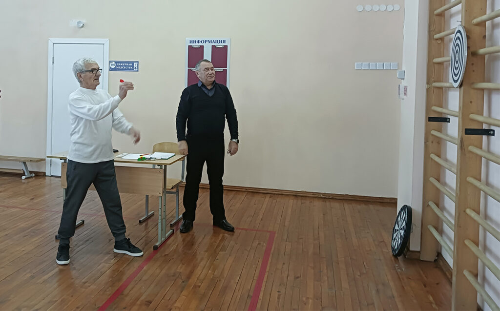 А участники проходили три вида состязаний – стрельба из пневматической винтовки, дартс, стритбол. За правильностью выполнения следила судейская коллегия – Александр Бутыркин, председатель районного Совета ветеранов во главе с главным судьёй Александром Тюриным.