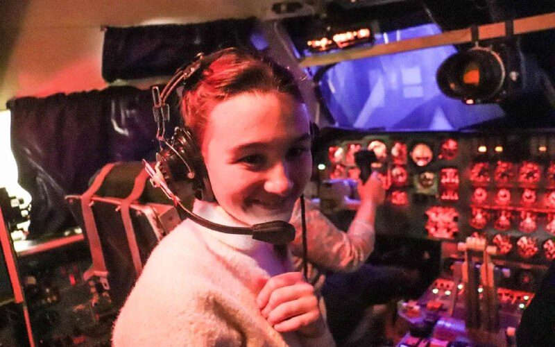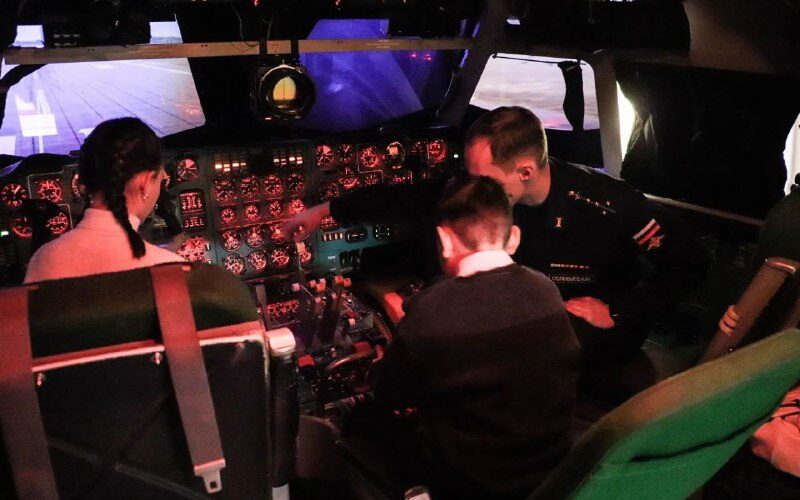 Дима и Юля познакомились с историей авиации и полка в местном музее, а также посетили настоящий тренажер будущих летчиков – кабину, имитирующую полеты на самолете. Ребята пообщались с действующими летчиками и штурманами.