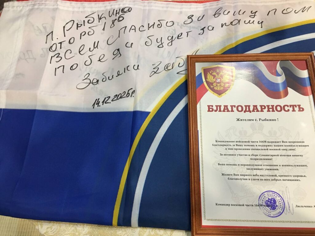 Всем селом собирали средства ребятам на покупку необходимых вещей и приборов – более 500 тысяч рублей. Купили квадроцикл вскладчину с другими группами (360 тысяч рублей). От жителей села было собранно около 100 тысяч. Ребята поблагодарили жителей Рыбкино. Также много было отправлено на фронт и в госпитали продуктов питания: сало, соления, тушенка, тёплые вещи, одеяла. На данный момент ведётся сбор средств для приобретения прицела, стоимость 300 тысяч рублей.